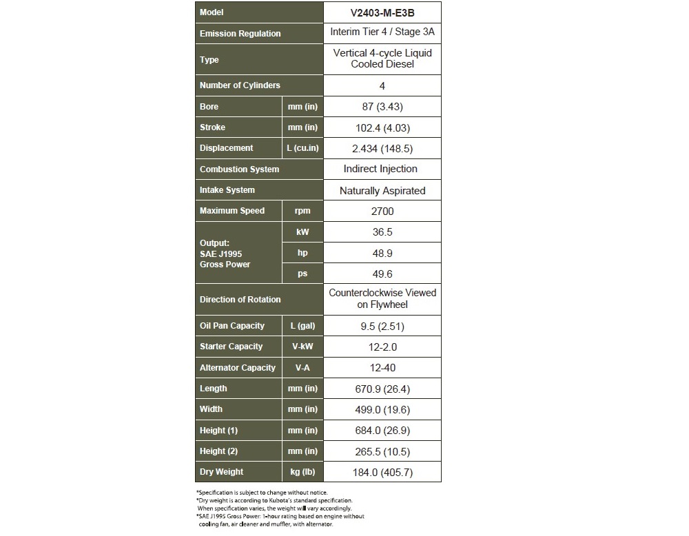 Bir önceki egzoz emisyon standardı olan EPA Tier 2 egzoz emisyon standardına uygun V2403M model dizel motorlar, motor taban alanı ve donanım akuple bağlantı noktaları birebir korunurken çok az bir performans değişikliği ile, EPA Tier 2 egzoz emisyon standardından EPA Tier 4 İnterim egzoz emisyon standardına uygunluk geçişi eksiksiz bir şekilde sağlanmıştır.