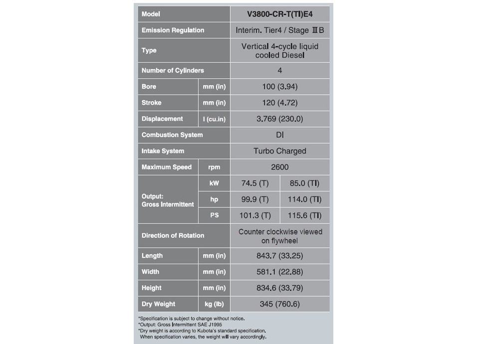 Kubota V3800 model direk enjeksiyonlu turboşarjlı dizel motor, 2011 yılı sonundan beri yürürlükte olan Amerikan EPA Tier 3 egzoz emisyon standartı ve Avrupa Birliği EU Stage III egzoz emisyon standartlarına uygundur. Gereken en az ek cihaz ile egzoz emisyon standartlarına uygun hale getirilmektedir: EGR (Egzoz Gazı Re-sirkülasyon) sistemi gibi sadece mekanik yöntemlerle Azot Oksit ölçüm değerlerini standartların emrettiği değerlere indirebilmektedir.